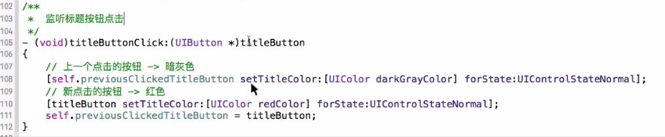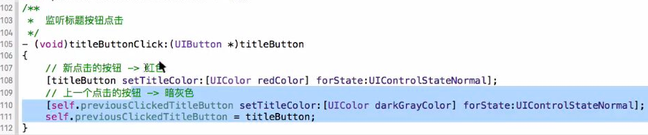 // 在自定义按钮中统一设置所有标题按钮各种状态的颜色 - (instancetype)initWithFrame:(CGRect)frame{ if ([super initWithFrame:frame]) { // 在这里统一设置字体颜色这字体的大小 self.titleLabel.font = [UIFont systemFontOfSize:16]; [self setTitleColor:[UIColor whiteColor] forState:UIControlStateNormal]; [self setTitleColor:[UIColor redColor] forState:UIControlStateSelected]; } return self; }/** * 监听标题按钮点击 */ - (void)titleButtonClick:(XMGTitleButton *)titleButton { // 修改按钮的状态 // 上一个点击的按钮 -> 暗灰色 self.previousClickedTitleButton.selected = NO; // 新点击的按钮 -> 红色 titleButton.selected = YES; self.previousClickedTitleButton = titleButton; // 下划线 [UIView animateWithDuration:0.25 animations:^{ self.titleUnderline.xmg_width = titleButton.titleLabel.xmg_width + 10; self.titleUnderline.xmg_centerX = titleButton.xmg_centerX; }]; }注意: 如果使用选中状态, 还是能够接受事件, 这时候如果在点击, 就会有选中状态和高亮状态都设置了, 这时候就会显示 normal 的颜色了, 因此要自定按钮,将高亮状态取消(重写高亮状态的 get / set 方法,)即可